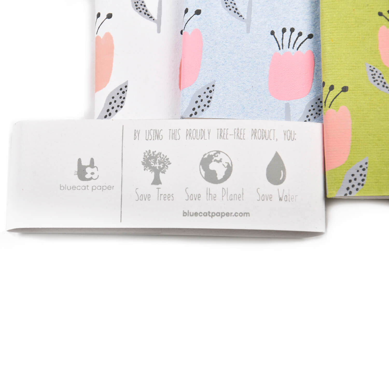 This tree-free stationery is secured with a white cotton paper band with a hand-printed Bluecat Paper logo that shows how you save the planet with responsible paper